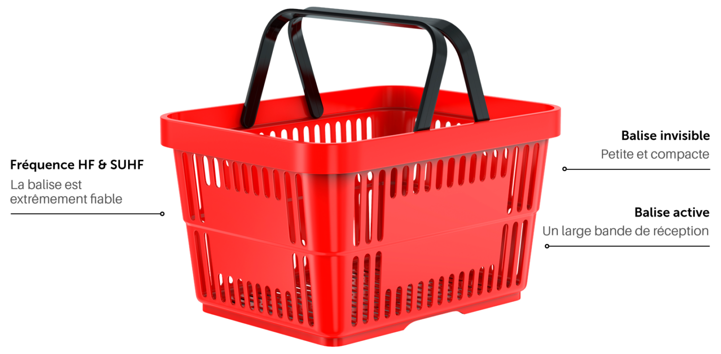 La balise Rocateq est fixée au panier à un endroit à peine visible pour le client. Chaque fois que votre client essaiera de quitter le magasin avec un panier et passera le signal sans fil, la balise sonnera.